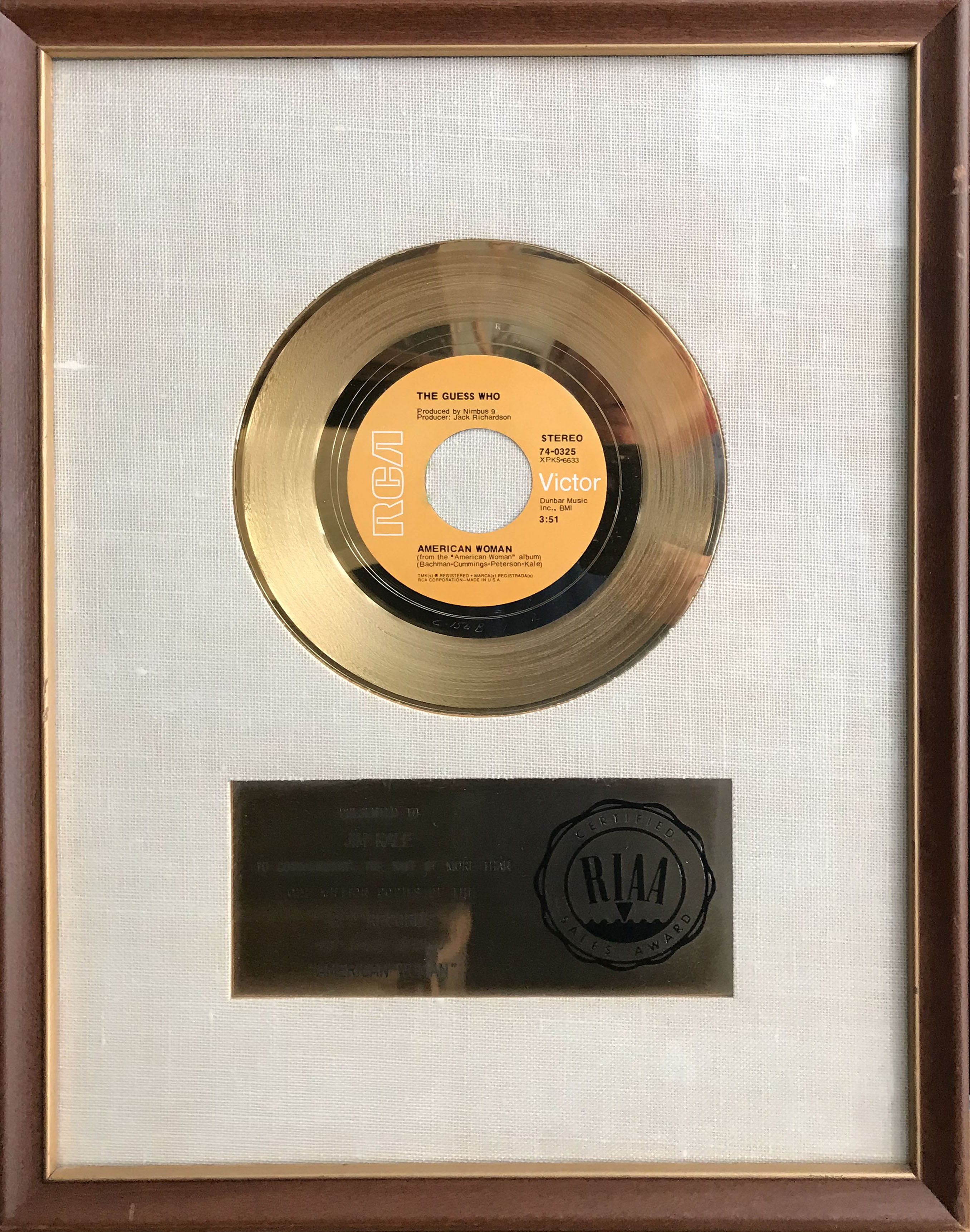 The Guess Who collection of Gold records received a big boost in mid-December when bassist Jim Kale donated the gold copies of America Woman, both the 45 RPN and the long play plus the Broadcast Measurement Inc. certificate marking the One Millionth air play of the 1970 smash hit.