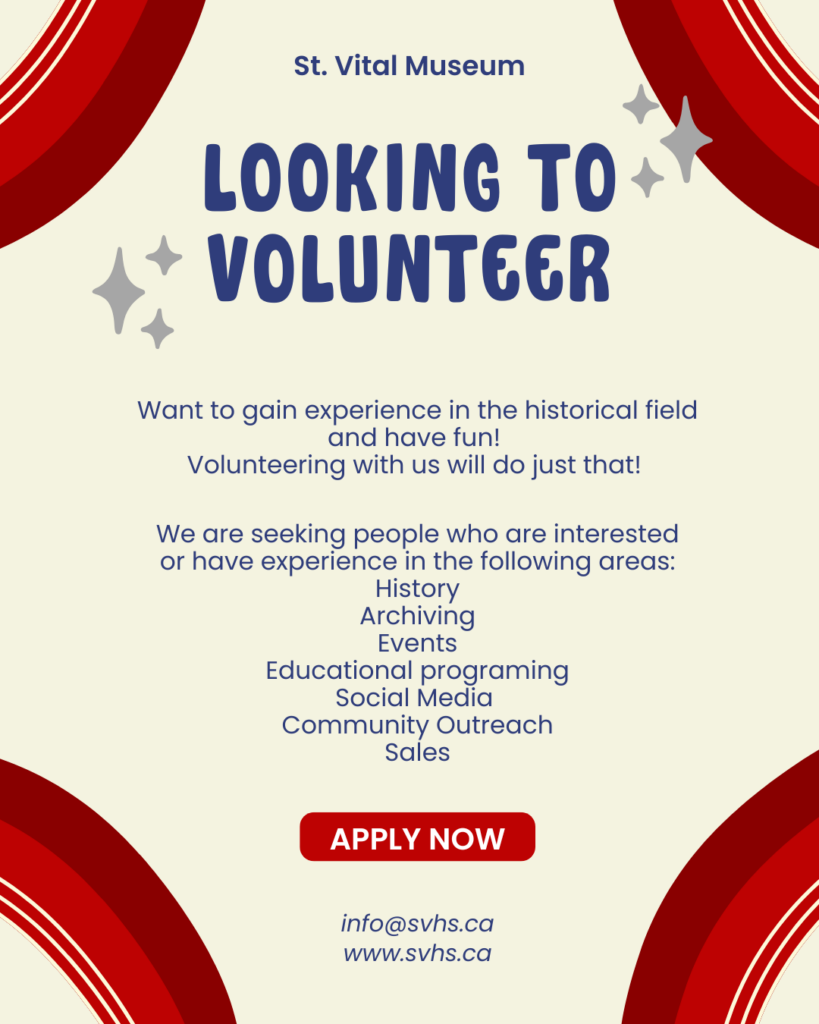 Were seeking new volunteers to help the St. Vital Museum grow! If interested please contact the museum by email, or fill out a volunteer from on our website. (The from is available on our Support page.)